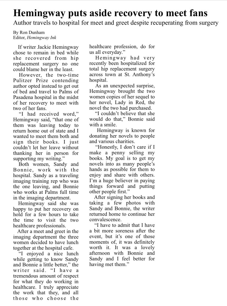Hemingway puts aside recovery to meet fans Bonnie, Jackie Hemingway and Sandy at Palms of Pasadena hospital. Share this: Click to share on X (Opens in new window) X Click to share on Facebook (Opens in new window) Facebook Like Loading... Related Leave a comment Cancel reply Δ